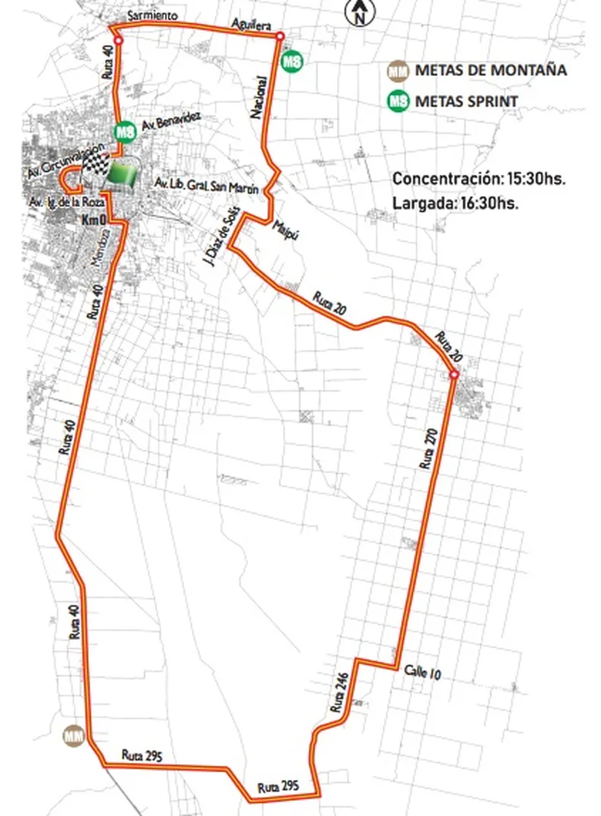 La concentración de los ciclistas está programada para las 15:30, mientras que la largada oficial se realizará a las 16:30. Los participantes tomarán la Avenida Central en dirección este hasta llegar a la Plaza 25 de Mayo. Posteriormente, darán un giro alrededor de la plaza principal del departamento Capital y continuarán por la calle Mendoza hacia el sur. El punto de inicio efectivo de la etapa será en la intersección de las calles Mendoza y Avenida de Circunvalación.