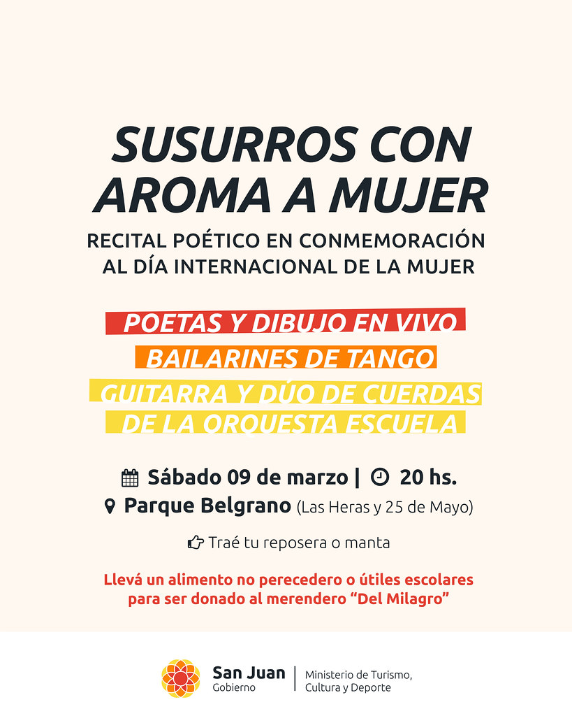 Asimismo, el Parque Belgrano acogerá “Susurros con aroma a mujer” el sábado 9, desde las 20. Este recital poético contará con la participación de 15 poetas sanjuaninos, dibujo en vivo, bailarines de tango, guitarra y dúo de cuerdas de la Orquesta Escuela.