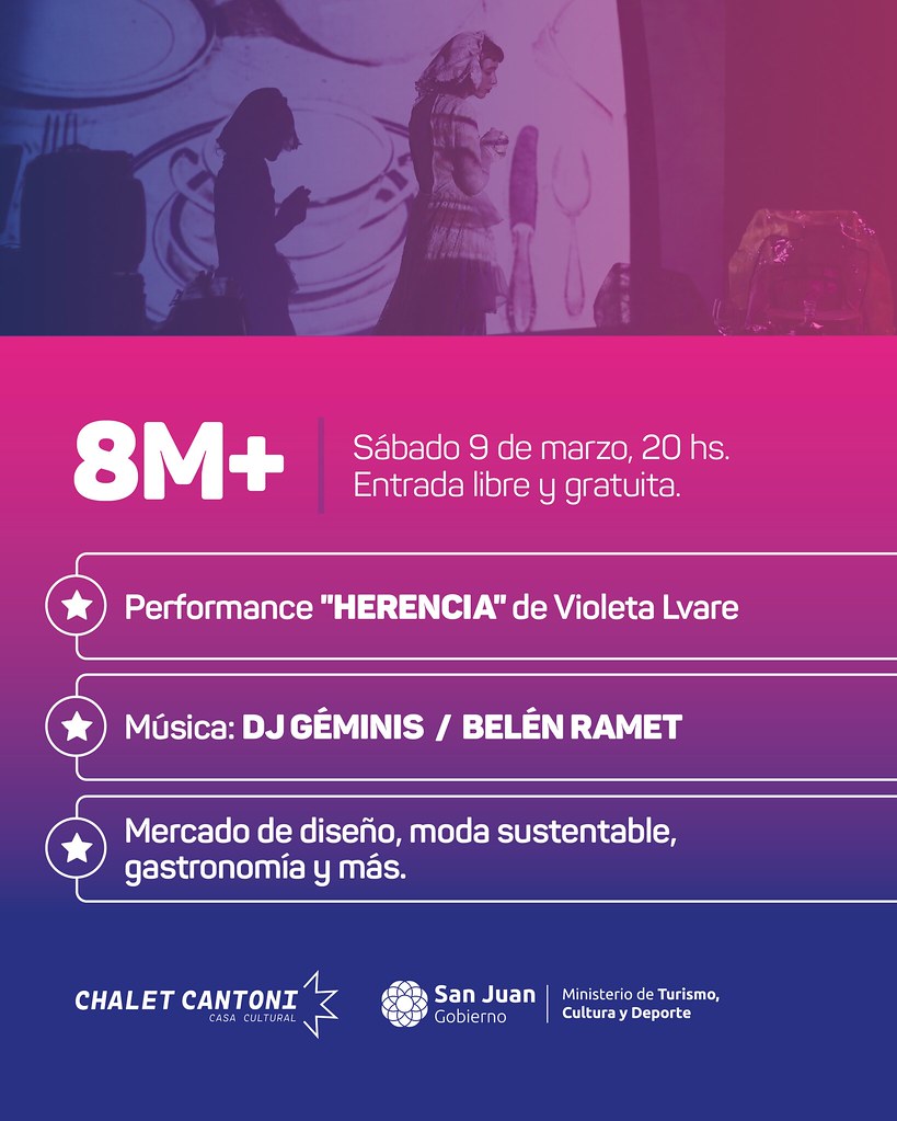 Otra propuesta destacada, también del sábado, es “8M+” en el Chalet Cantoni, un evento que combina diversas expresiones artísticas y de diseño. Con música en vivo a cargo de Dj Géminis y Belén Ramet, la performance audiovisual “Herencia” de Violeta Lvare, un mercado de diseño y moda sustentable, gastronomía y más. La cita es desde las 20, con entrada es libre y gratuita.