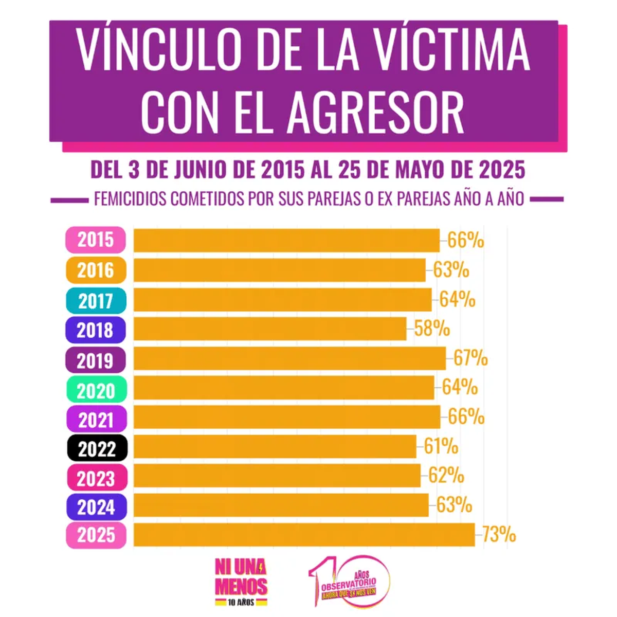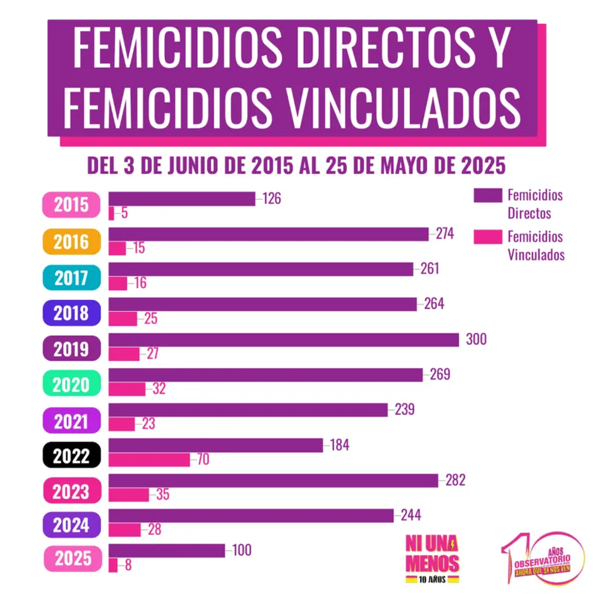Desde el Observatorio de las Violencias de Género “Ahora Que Sí Nos Ven” informaron que en estos 10 años del primer Ni Una Menos hubo 2827 femicidios (2543 directos y 284 vinculados). Los datos surgieron del análisis de medios gráficos y digitales de todo el país. El informe abarca desde el 3 de junio de 2015y el 25 de mayo de 2025 y arroja que hubo un femicidio cada 31 horas.