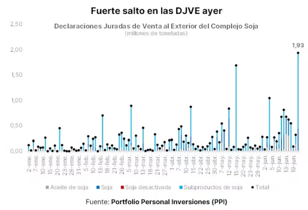 “Los exportadores pueden asegurar las retenciones vigentes simplemente registrando una Declaración Jurada de Venta al Exterior (DJVE) antes del 1° de julio, y luego cuentan con hasta 15 días hábiles para ingresar el 95% de las divisas correspondientes. Así, es probable que la liquidación del agro siga mostrando un ritmo elevado al menos hasta el 23 de julio“, explicó PPI en su reporte diario.