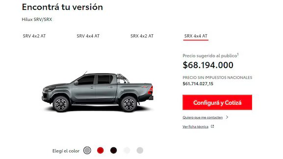 Sin embargo, también en la misma web de Toyota, se puede ver más claramente la diferente situación impositiva de los vehículos comerciales o utilitarios livianos, como son los furgones o las pickups, los cuales son considerados como vehículos destinados a la producción y por lo tanto pagan el 10,5% de IVA y no el 21%, como los autos particulares y los SUV.