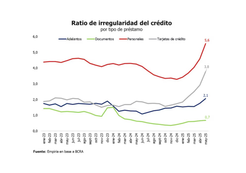 Según los últimos datos oficiales disponibles, la irregularidad en el stock total de préstamos al sector privado creció del 1,8% al 2,6% entre junio de 2024 y mayo de 2025. Dentro de ese escenario, se destacó el crecimiento de la morosidad en el financiamiento con tarjetas de crédito, que en el plazo de un año se duplicó, ya que pasó del 1,9% al 3,8%. También creció el porcentaje de préstamos en situación irregular en el caso de los créditos personales, que creció del 4,1% al 5,6%, confirmando que las líneas orientadas al consumo han registrado un alza en los incumplimientos.