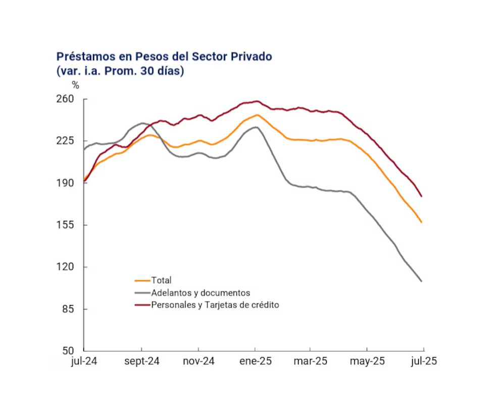 El estancamiento del crédito en julio se completa con otras líneas como descuento de documentos (1,2%), personales (2,8%), prendarios (1,6%) y adelantos (4,7%), todas cifras que muestran desaceleración en relación con los meses anteriores.