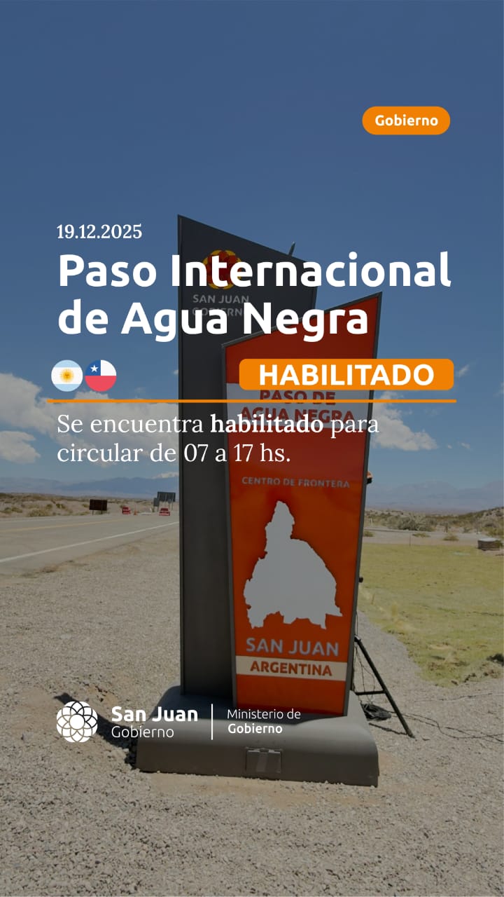 El Ministerio de Gobierno de San Juan informó el estado actualizado del Paso Internacional por Agua Negra, confirmando que este jueves 19 de diciembre el corredor fronterizo se encuentra habilitado para la circulación vehicular, con horario restringido de 07:00 a 17:00 horas, sobre la Ruta Nacional 150.