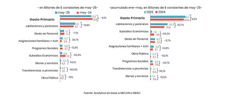 También estuvieron el gasto en personal -salarios públicos- con una caída de 7,1% en mayo y 9,7% en términos acumulados en 2025. En otros programas sociales (por fuera de asignaciones familiares y AUH) el retroceso fue de 12,8% en el quinto mes del año y 20,7% en lo que va del año. Por el contrario, hubo incrementos reales en jubilaciones y pensiones (10,8% en mayo y 20,7% en 2025), mientras que asignaciones familiares y AUH fueron de 39,7% y 24,8%, respectivamente. Estas últimas partidas están atadas a la evolución de la inflación.