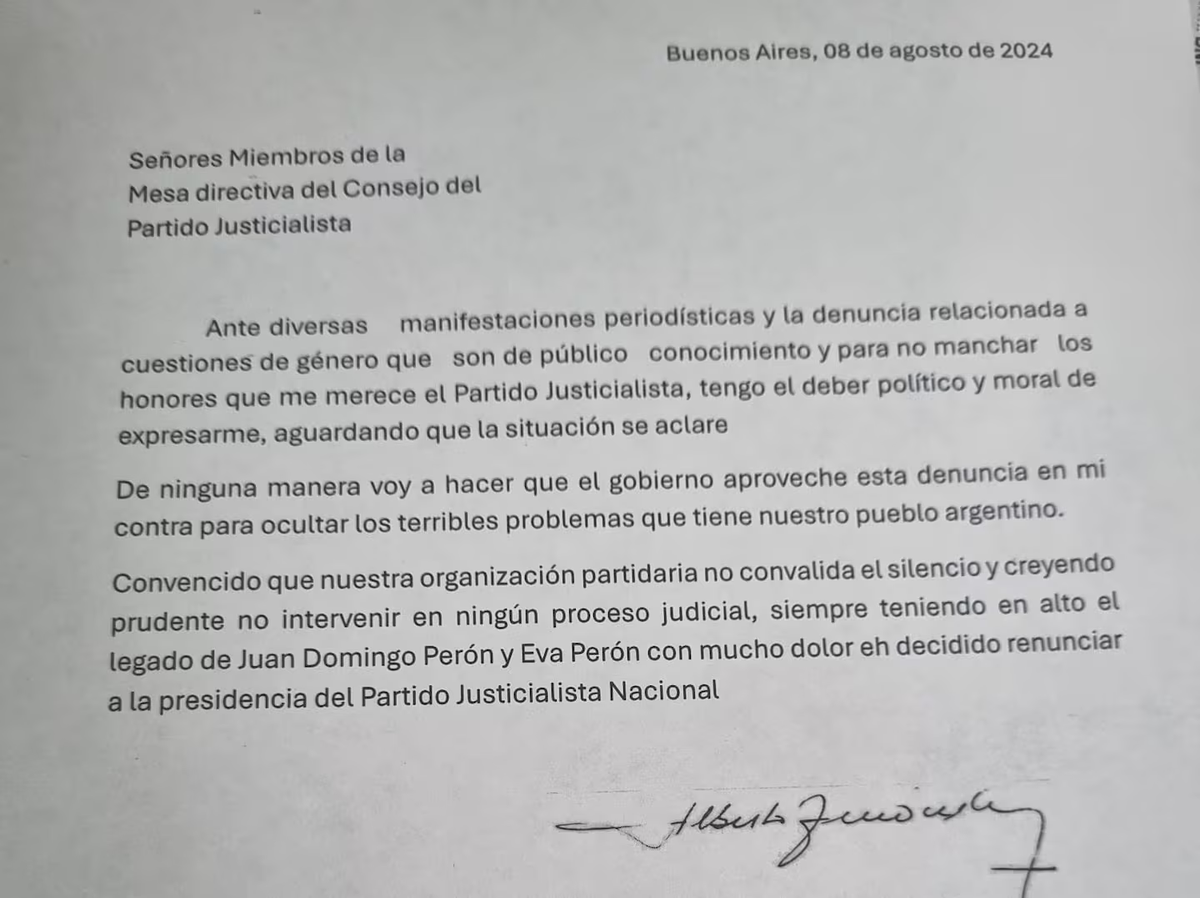Convencido que nuestra organización partidaria no convalida el silencio y creyendo prudente no intervenir en ningún proceso judicial, siempre teniendo en alto el legado de Juan Domingo Perón y Eva Perón con mucho dolor, he decidido renunciar a la presidencia del Partido Justicialista Nacional”, culminó.