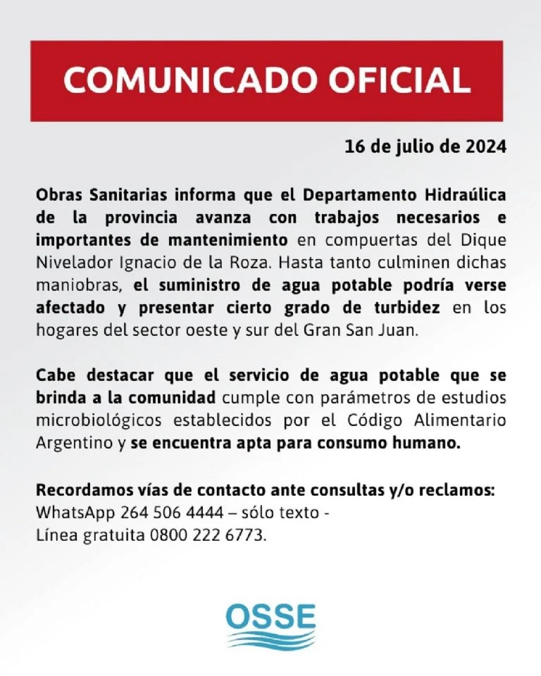 La empresa estatal OSSE ha informado a la población del Gran San Juan que el suministro de agua potable podría presentar cierto grado de turbidez en las zonas oeste y sur debido a "trabajos necesarios e importantes de mantenimiento" en las compuertas del Dique Nivelador Ignacio de la Roza.