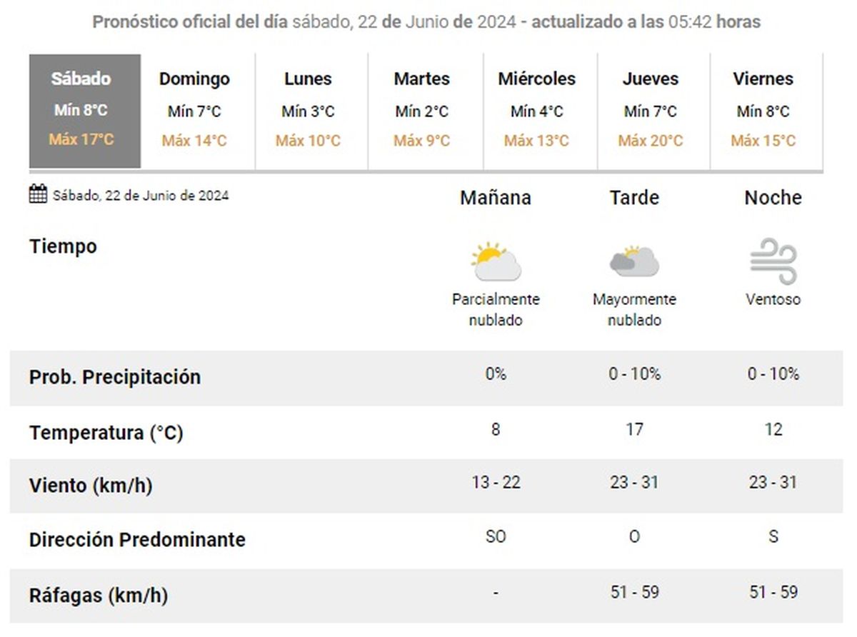 El SMN prevé para la tarde, que el viento Zonda tenga una intensidad de hasta 31 km/h y ráfagas de hasta 59 km/h, con cielo mayormente nublado. Con la misma intensidad, se espera la llegada de viento sur para la noche, que permanecerá ventoso.