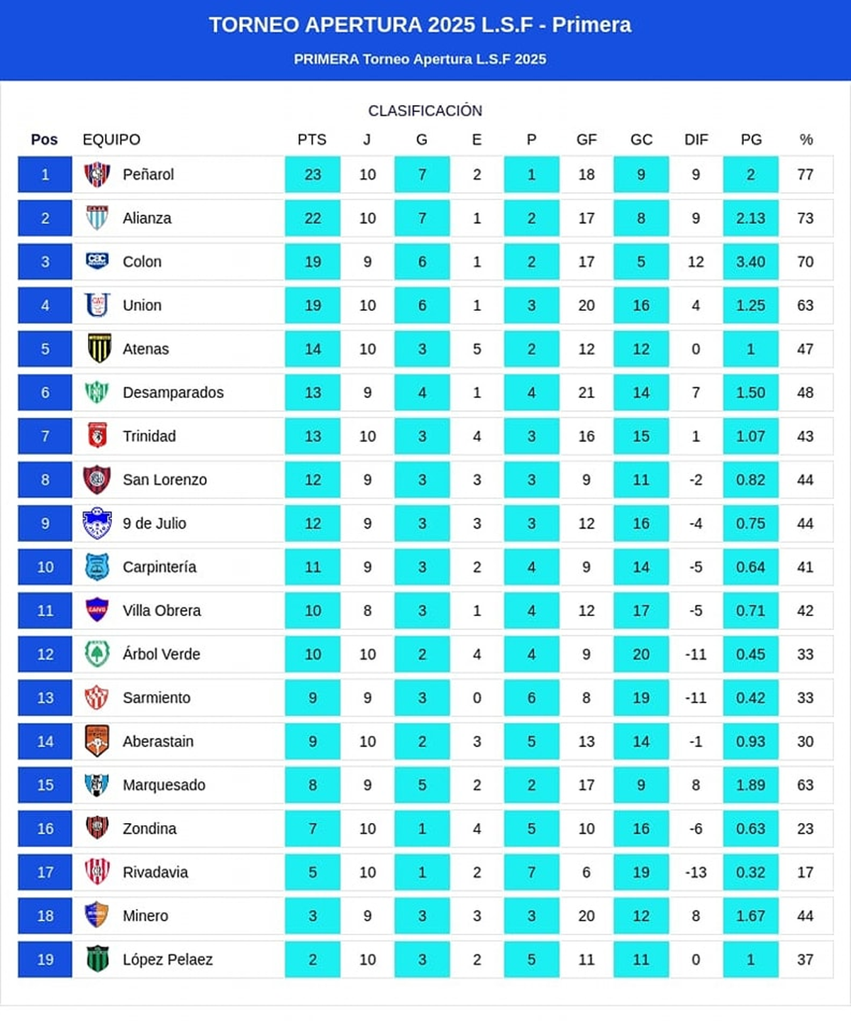 La Liga Sanjuanina de Fútbol completó la fecha 10 del Torneo Apertura en la tarde del domingo. Alianza, Trinidad y Unión ganaron sus partidos y en Pocito fue empate entre Aberastain y San Lorenzo de Ullum. Peñarol continúa en lo más alto de la tabla de posiciones.