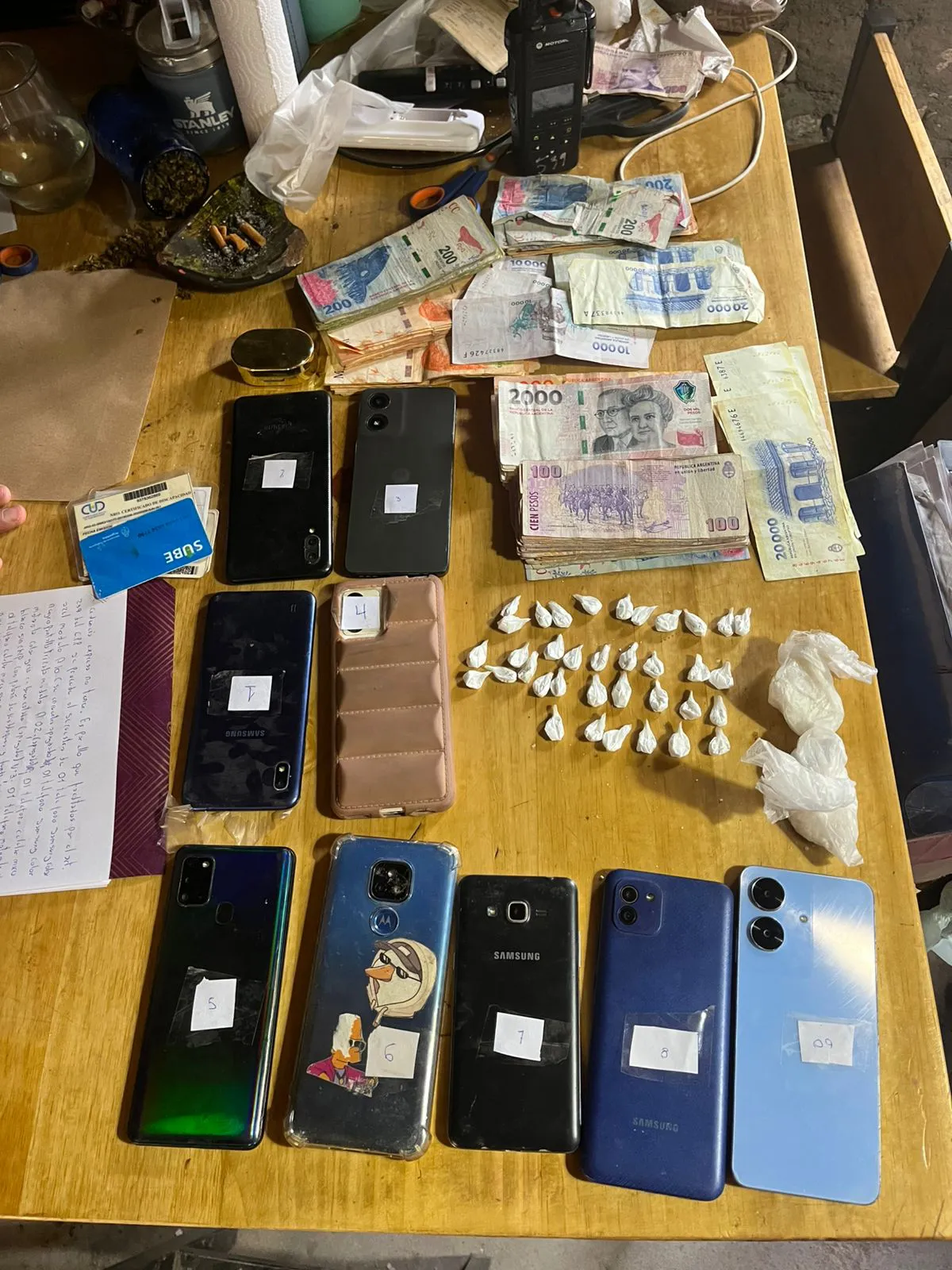 En el procedimiento también se produjo un hallazgo de mayor gravedad: los uniformados encontraron sustancias estupefacientes que, tras el pesaje correspondiente, arrojaron un total de 420 gramos de cocaína. Además, se incautó dinero en efectivo y seis teléfonos celulares, que serán sometidos a peritajes para determinar su origen y posible relación con otros hechos delictivos.