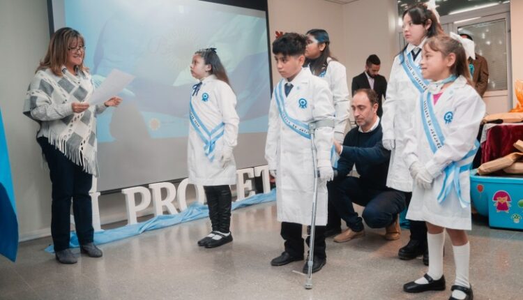 Los ministros de Educación, Silvia Fuentes, y de Salud, Amílcar Dobladez, encabezaron el acto de Promesa a la Bandera en el SUM del área Pediátrica del Hospital Rawson. Los cinco estudiantes son pacientes que se encuentran internados por diversas patologías, pero continúan con sus trayectorias pedagógicas en la Escuela Hospitalaria.