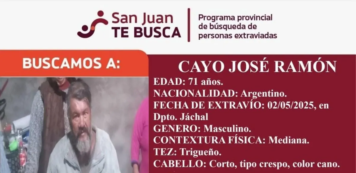 La incertidumbre y el dolor crecen con el paso de los días. Ya se cumplen ocho jornadas desde que se denunció la desaparición de José Ramón Cayo, un hombre de 71 años que vivía solo en una precaria vivienda ubicada en la zona de El Rincón, en el departamento Jáchal. Desde entonces, más de 60 personas participan de un extenso y coordinado operativo de búsqueda por aire, tierra y agua, sin que hasta ahora se haya podido dar con su paradero.