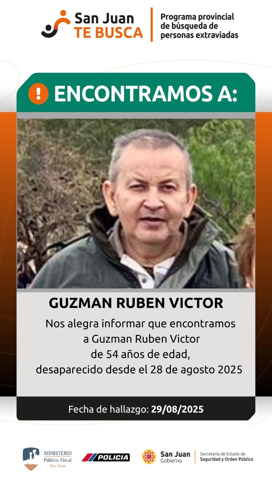 Tras días de búsqueda, el programa policial “San Juan Te Busca” comunicó que Rubén Víctor Guzmán fue hallado en buen estado de salud. No se divulgaron detalles sobre su paradero.
