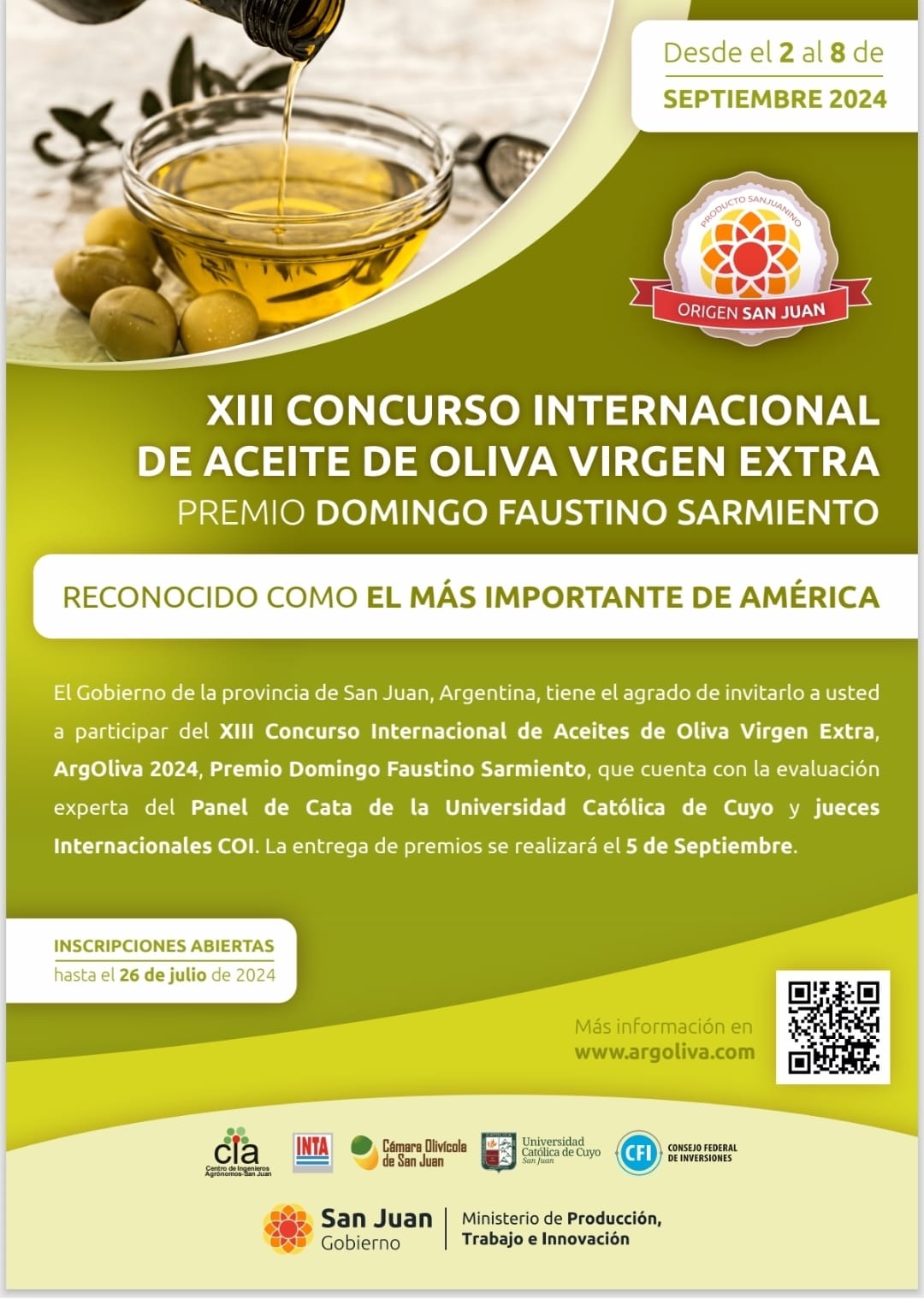 Comienza a tomar color el encuentro olivícola más importante de América; evento a realizarse desde el 2 al 8 de septiembre y que cuenta con el XIII Concurso Internacional de Aceites de Oliva Virgen Extra (AOVE) “Premio Domingo Faustino Sarmiento”.