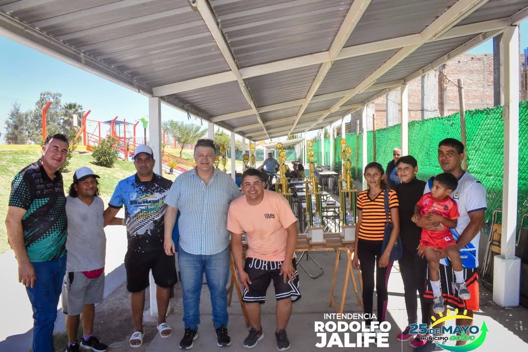 El intendente de 25 de Mayo, Rodolfo Jalife, junto al concejal Alberto Plaza, realizó la entrega de trofeos para el Torneo de Veteranos Libres de Fútbol 8, organizado por el Club Boca, con el objetivo de recaudar fondos para su remodelación.