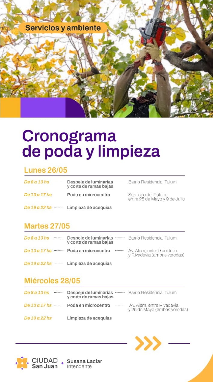 La Municipalidad de la Ciudad de San Juan lanza su cronograma semanal de poda y mantenimiento del arbolado público, que incluye despeje de luminarias, corte de ramas bajas y limpieza de acequias en distintos sectores.