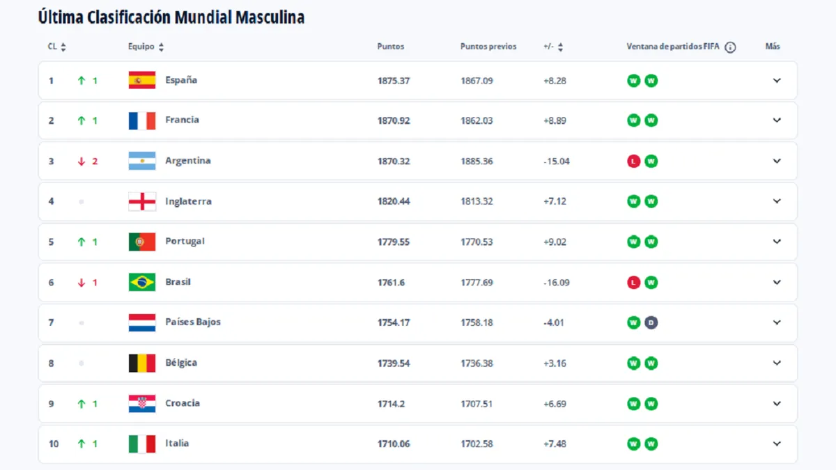 España (1ª, sin cambios) sumó dos triunfos que le valen para seguir líder tras lograr el primer puesto en la anterior clasificación, cuando puso fin al reinado de Argentina (2ª, +1) desde abril de 2023. La Albiceleste, actual campeona del mundo, se coloca segunda tras superar a una Francia (3ª, -1) a la que le penaliza el empate 2-2 en su visita a Islandia en los recientes clasificatorios de la UEFA para la Copa Mundial de la FIFA 26.