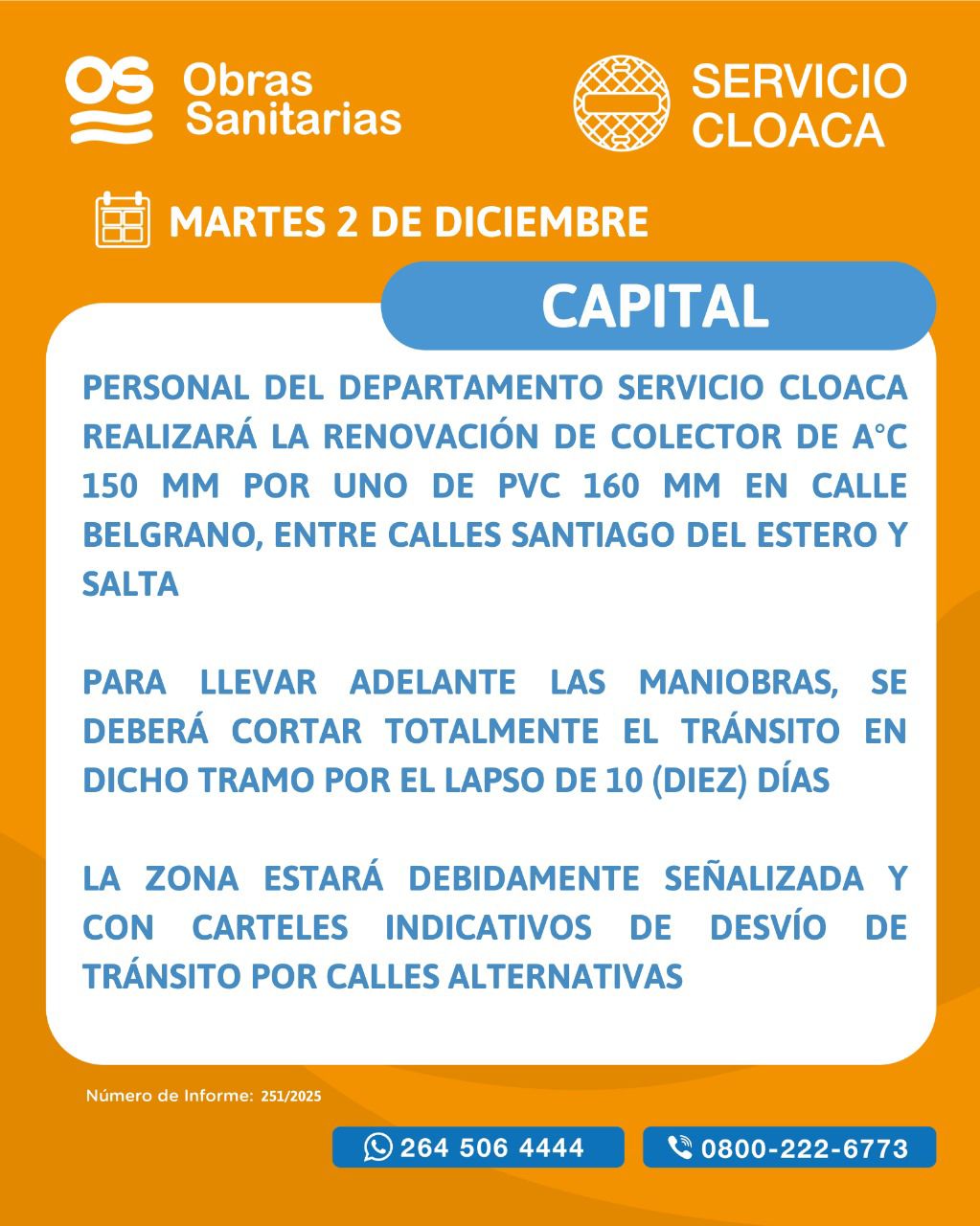 A partir del martes 2 de diciembre, se iniciarán trabajos de renovación de la red de cañerías en calle Belgrano, en el tramo comprendido entre Santiago del Estero y Salta.