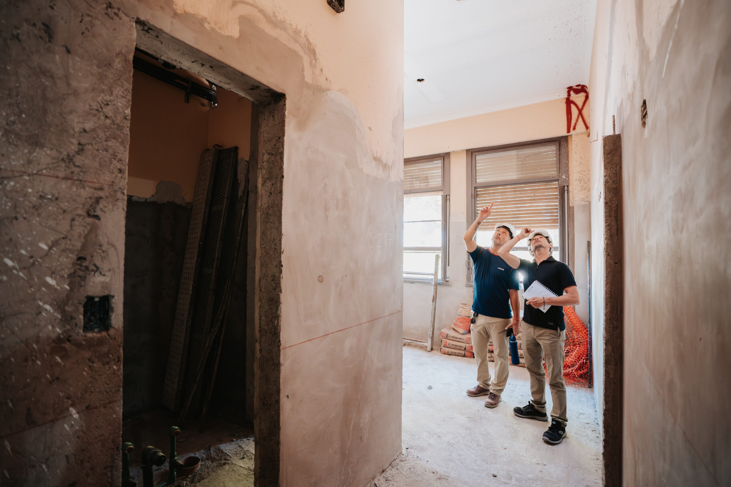 En paralelo, se preparan en la azotea las estructuras que alojarán equipos de climatización, como chiller y módulos hidrónicos, destinados a optimizar la regulación térmica del edificio. También se ejecutan trabajos en salas técnicas, con bases de hormigón y tareas previas a la impermeabilización.