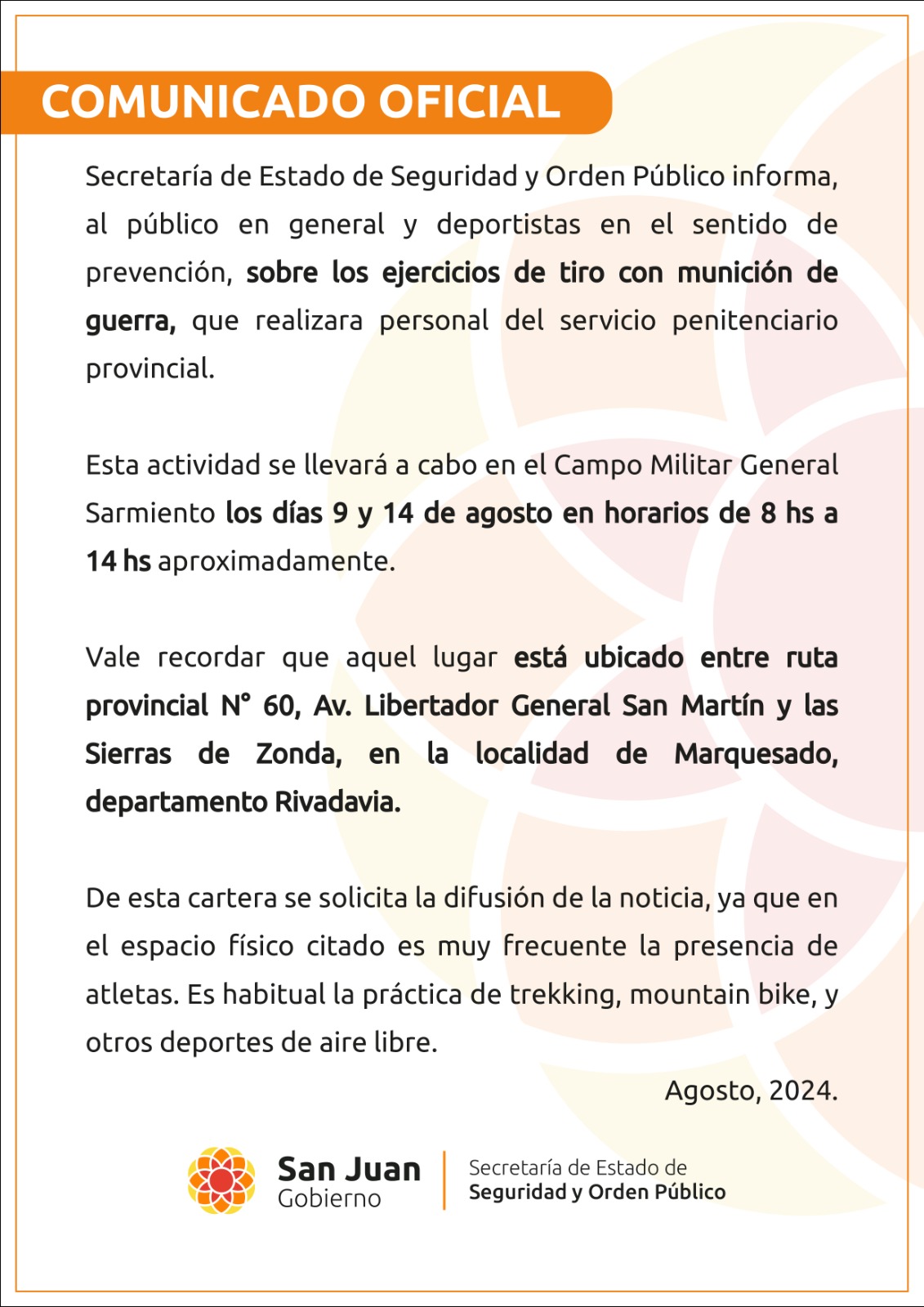 La Secretaría de Estado de Seguridad y Orden Público informa a la comunidad y a los deportistas que el personal del Servicio Penitenciario Provincial realizará ejercicios de tiro con munición de guerra en el Campo Militar General Sarmiento.