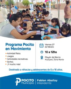 El playón del Barrio Huarpes en Zona Norte recibirá el programa "Pocito en Movimiento" el próximo viernes 27 de febrero de 10 a 12 horas.