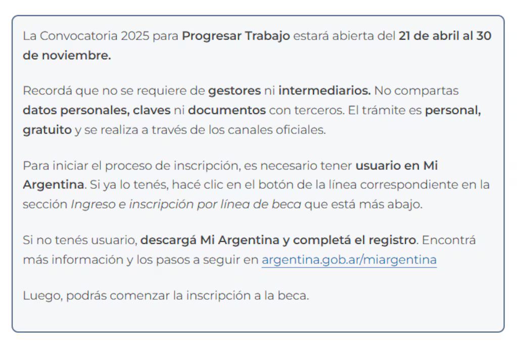 1. Ingresar a la plataforma Mi Argentina: si ya tenés un usuario, simplemente accedé a la sección “Ingreso e inscripción por línea de beca” y hacé clic en Progresar Trabajo. Si aún no tenés cuenta, debés descargar la aplicación Mi Argentina y completar el registro con tus datos personales.