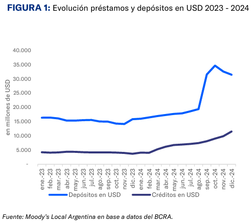 Moody’s advirtió sobre los peligros de un descalce de monedas y de un aumento en la mora. Pero a la vez, confirmó que los dólares también tienen un papel de relevancia en el financiamiento motivado por “la gradual normalización de la macro y destinado a empresas con ingresos en dólares” y fondeado con los depósitos del blanqueo. “El cambio normativo permitirá cubrir la demanda insatisfecha de crédito en moneda extranjera a empresas de sectores no exportadores o generadores de divisas”, concluyó Moody’s.