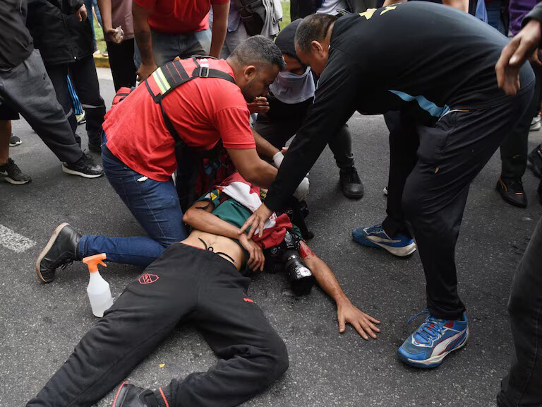 En otro momento de la entrevista, se refirió al caso de Grillo, el reportero gráfico que aún lucha por su vida tras ser herido en medio de los incidentes. En el video que pudo captar Gastón Taylor con el drone de Infobae, se puede ver al fotógrafo tratando de tomar registros de los incidentes (trabajaba de manera independiente en la cobertura de la marcha), hasta que es impactado por el cartucho de gas lacrimógeno que llega desde el lado donde estaban las fuerzas de seguridad.