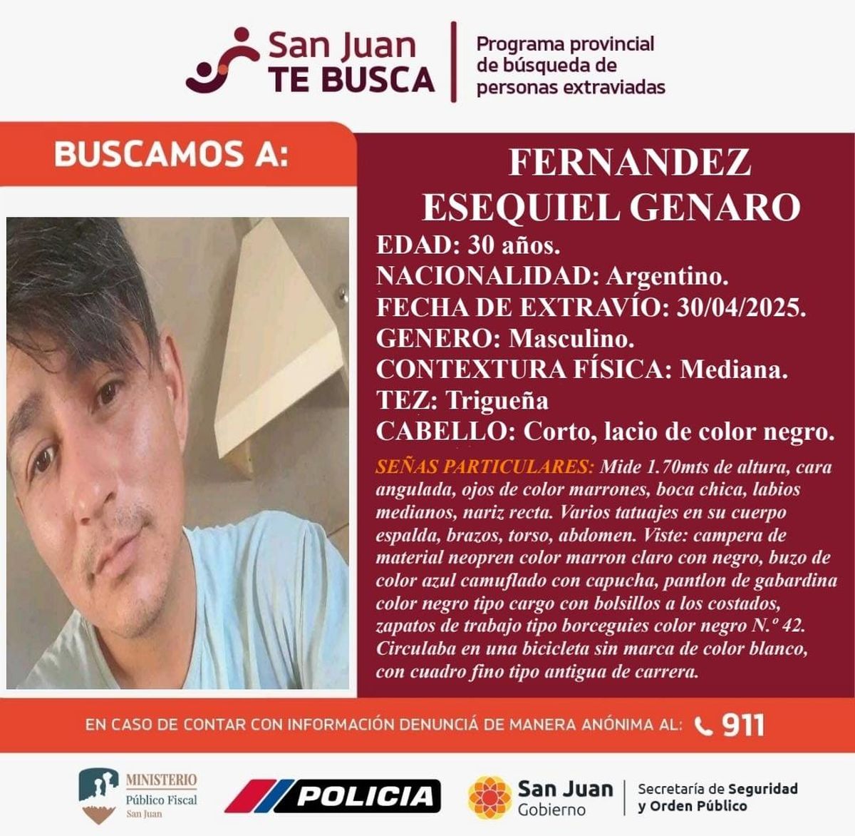 Se trata de Esequiel Genaro Fernández, de 30 años, del cual se lo vio por última vez el 30 de abril. El joven mide 1.70 metros, tiene cabello corto y lacio color negro y ojos marrones.