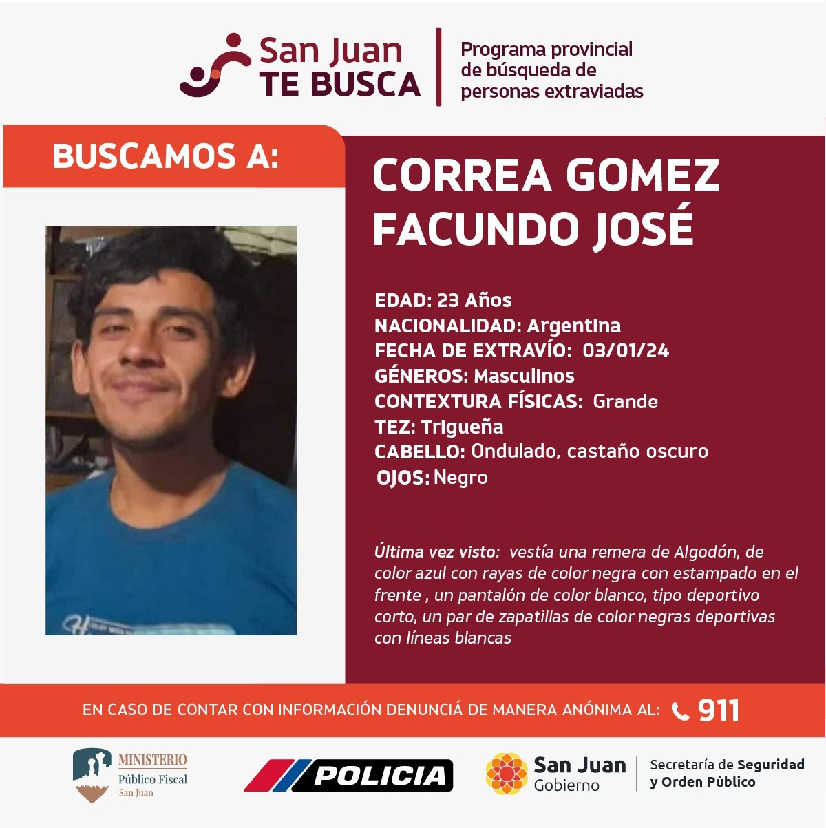 Facundo Correa, de contextura física grande, tez trigueña, cabello ondulado y castaño oscuro, con ojos negros, fue visto por última vez con una remera azul con rayas negras y estampado en el frente, un pantalón corto blanco y zapatillas deportivas negras con líneas blancas.
