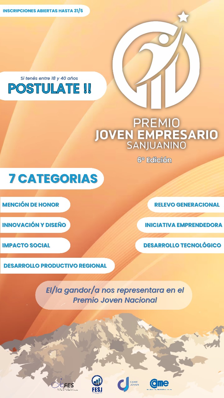 La Confederación Argentina de la Mediana Empresa (CAME), presentó oficialmente la sexta edición del Premio Joven Empresario SanJuanino 2025, un evento que por segunda vez integra la Mesa Nacional de Jóvenes Empresarios y reunirá en San Juan a emprendedores de todo el país el próximo 12 de junio en la provincia.