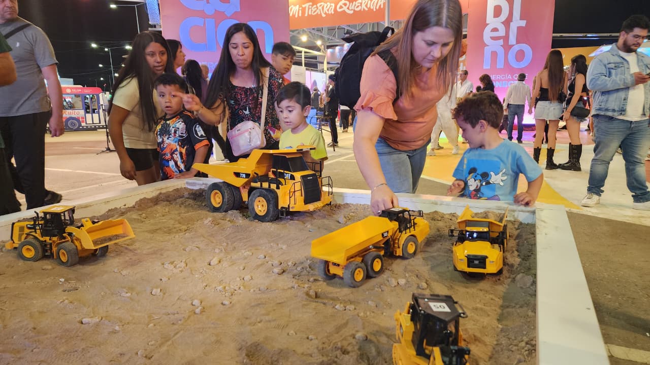 Para los más pequeños —y también para los adultos con espíritu lúdico— el cajón arenero fue una atracción irresistible. Allí, mediante controles remotos, se operaron equipos mineros en miniatura para cargar camiones, recreando el trabajo real en las minas.