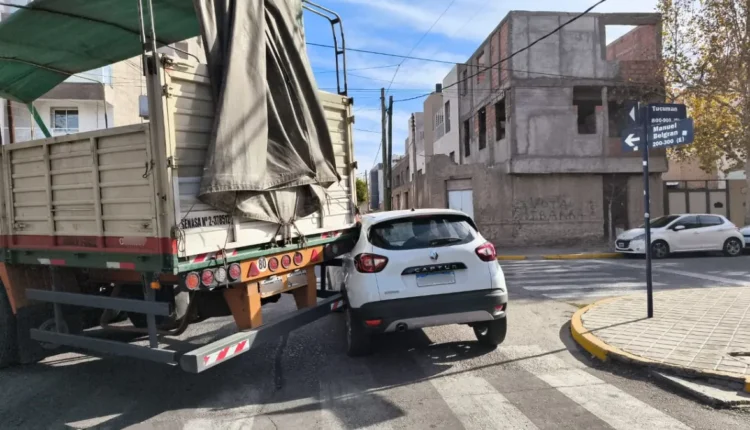 El hecho ocurrió alrededor de las 14, en una de las intersecciones más transitadas de Capital. Según testigos, ambos vehículos circulaban por calle Belgrano cuando, al llegar al cruce con Tucumán, el camión giró a la derecha y la camioneta intentó adelantarse por ese mismo lado. Fue en ese momento que se produjo el impacto: la parte trasera del acoplado enganchó a la Captur, que quedó trabada.