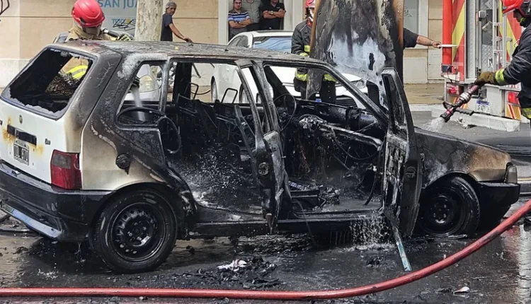 En la tarde de hoy, un Fiat Uno quedó completamente destruido por las llamas en la intersección de calle Ignacio de la Roza y Santiago del Estero, en Capital.