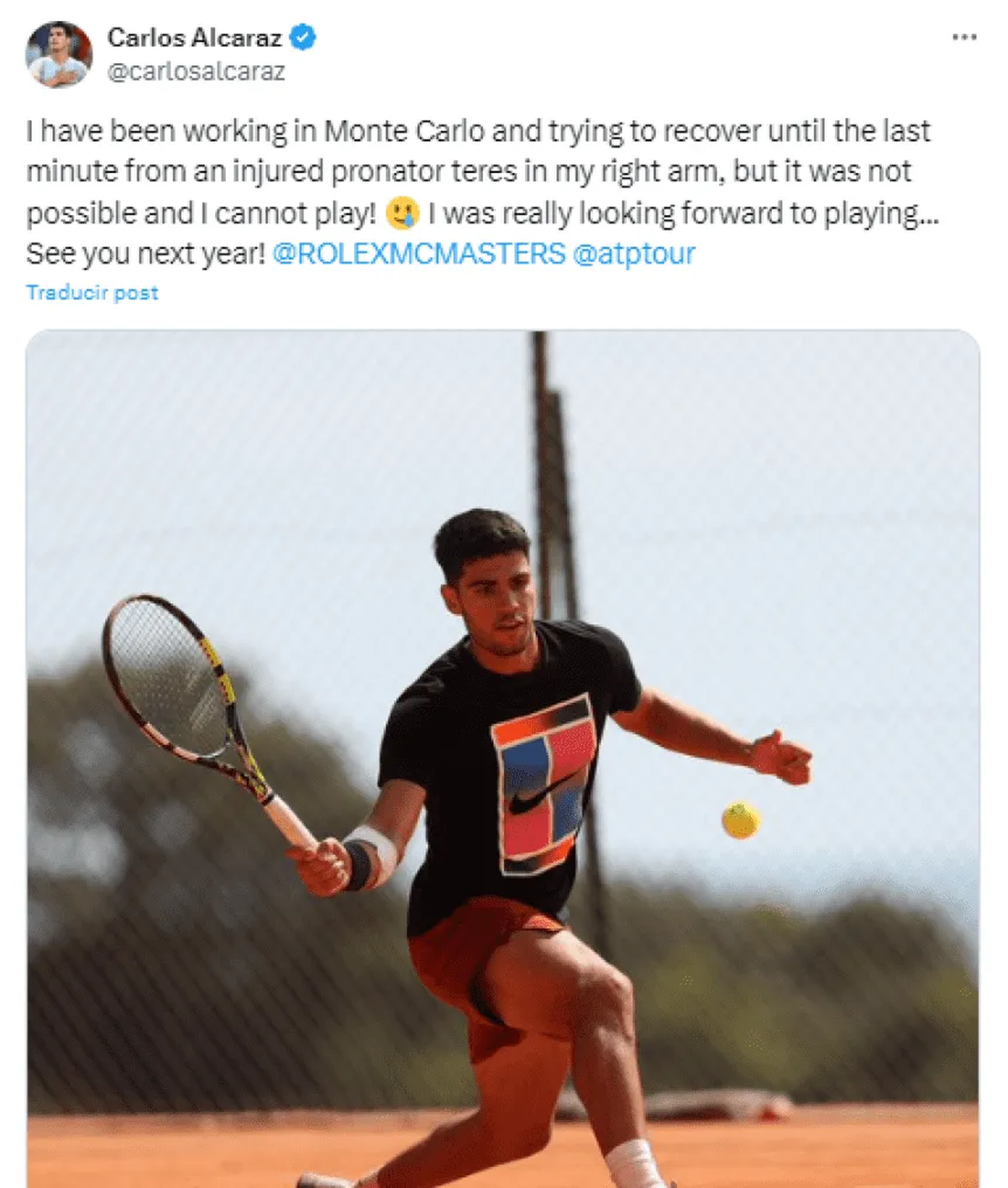 “He estado trabajando en Montecarlo e intentando recuperarme hasta el último momento de una lesión en el pronador redondo del brazo derecho, pero no ha sido posible y no puedo jugar. Tenía muchas ganas de jugar…. ¡Nos vemos el año que viene!”, informó Alcaraz este martes.
