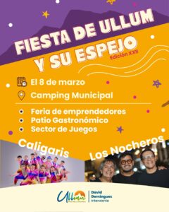 El domingo 8 de marzo tendrá lugar la gran “Fiesta de Ullum y su Espejo”, también en el Camping Municipal. Además de la feria y el patio gastronómico, se dispondrá un sector de juegos pensado para el disfrute de toda la familia.