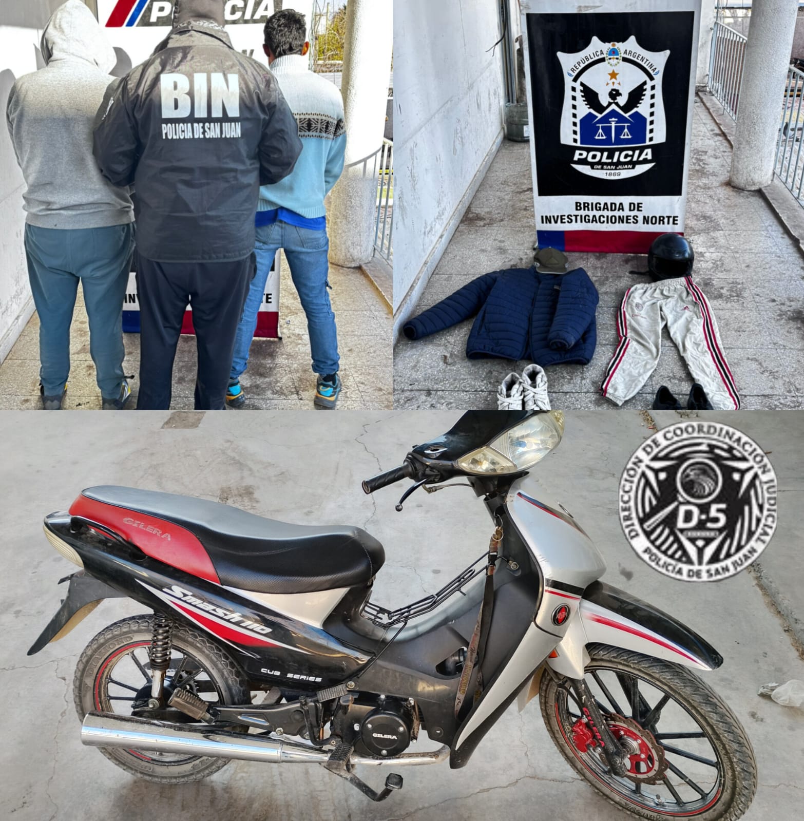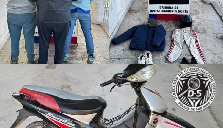 Dos delincuentes que actuaban en el departamento Chimbas fueron detenidos por personal de la Brigada de Investigaciones Norte. Se trata de Cristian Maximiliano Sánchez Moreyra, de 34 años, y Ramiro Alexís Castro Gónzalez, de 18, quienes están acusados de protagonizar una serie de robos a comercios utilizando una motocicleta como medio de escape.