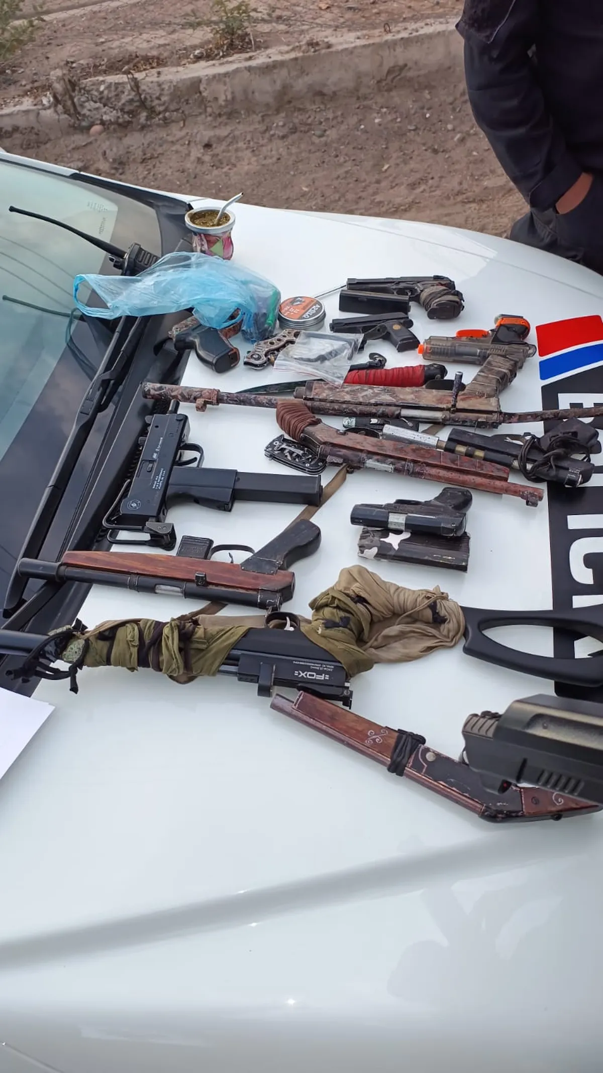 Durante el registro, encontraron 18 réplicas de armas de fuego, 8 armas blancas cortopunzantes, un gas pimienta y una lata con balines de aire comprimido. Además, y tras un aviso de la hermana del sospechoso, los uniformados revisaron la cama y hallaron una arma que sería de fuego real, lo que motivó la intervención del protocolo de Flagrancia.