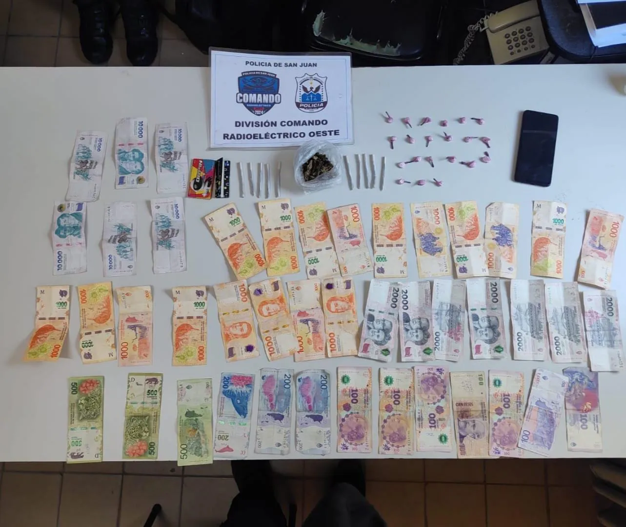 En poder del detenido se secuestraron 10 cigarrillos de armado casero con marihuana, 21 envoltorios plásticos con una sustancia blanca compatible con cocaína, una bolsa con material vegetal con fuerte olor a cannabis, papelillos para el armado de cigarrillos y la suma de 94.800 pesos en efectivo.