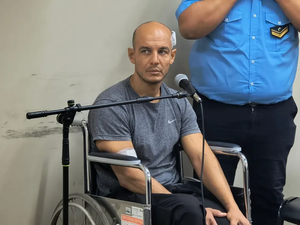 El acusado llegó a la audiencia en silla de ruedas, ya que sufrió lesiones en el siniestro y permanecía internado. Presenta una fractura en el tobillo izquierdo y diversas heridas cortantes.