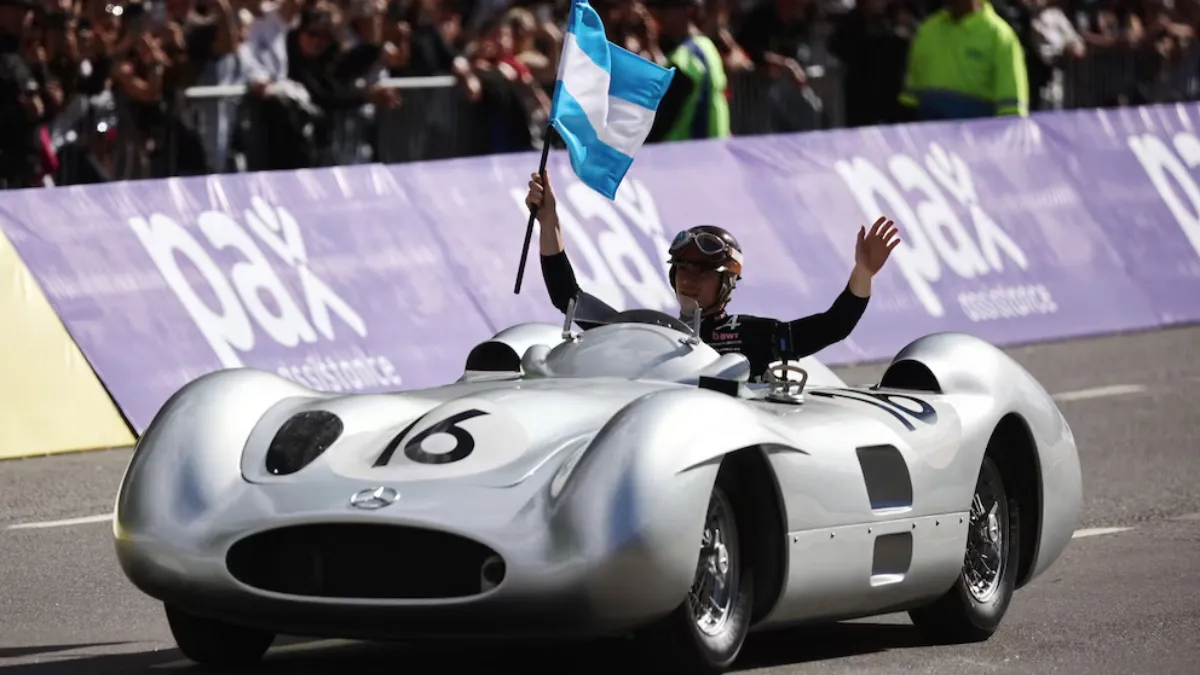 La segunda pasada hizo delirar a la gente: con las clásicas antiparras de lente dividido que usaban los corredores de mediados del siglo XX y una bandera argentina, Franco dio varias vueltas a bordo del Mercedes-Benz W196, una réplica del famoso Flecha de Plata con el que Juan Manuel Fangio ganó los campeonatos mundiales de 1954 y 1955. Resplandeciente, con dos escapes cromados asomándose por el costado derecho, llevaba el #16 en la trompa: el número que usó el quíntuple campeón mundial durante sus carreras más exitosas.