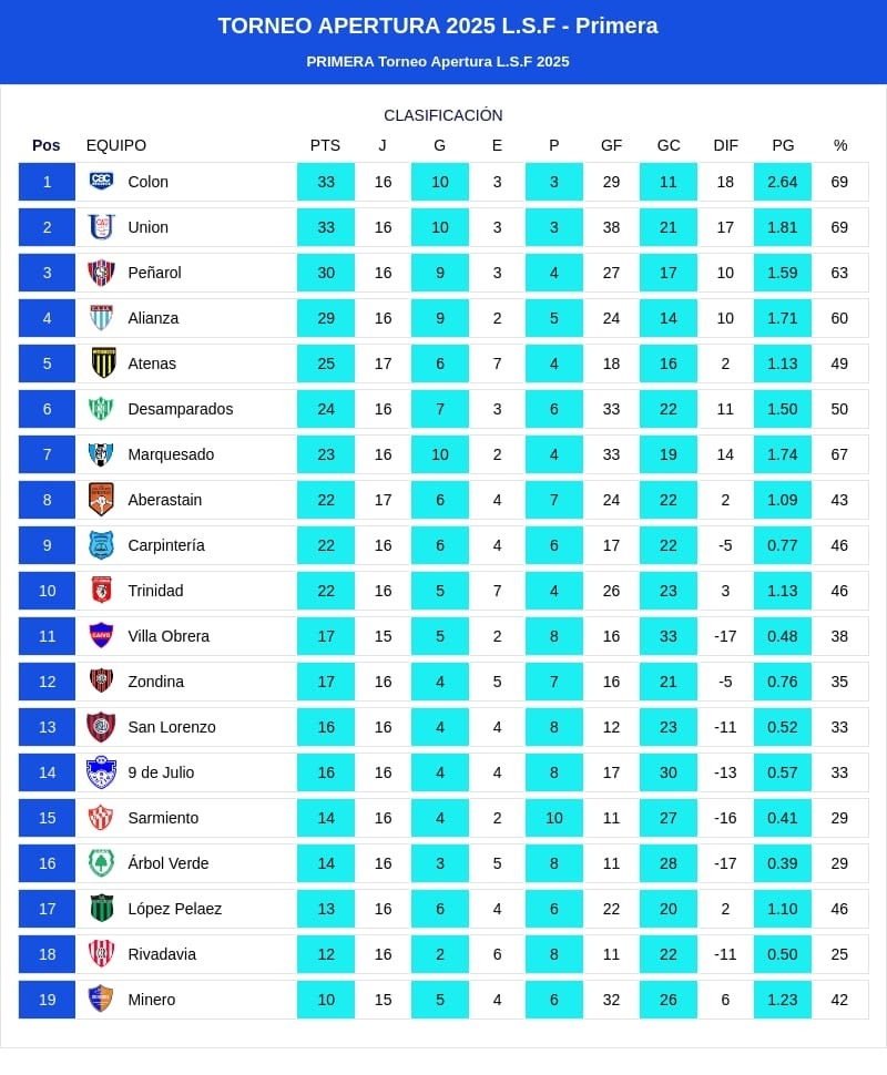 Este domingo se completó la fecha 17 del Torneo Apertura de la Liga Sanjuanina de Fútbol y, aunque hubo acción en todas las canchas, la cima del campeonato no tuvo modificaciones: tanto Unión como Colón Junior empataron sus respectivos compromisos y no lograron sacarse ventaja en la lucha por el liderazgo en soledad. El Azul de Villa Krause dejó pasar una oportunidad clave, ya que conocía el resultado de Colón antes de jugar. Así, ambos comparten la cima del torneo, mientras los equipos que los persiguen aún mantienen la ilusión de alcanzarlos en las últimas dos fechas.
