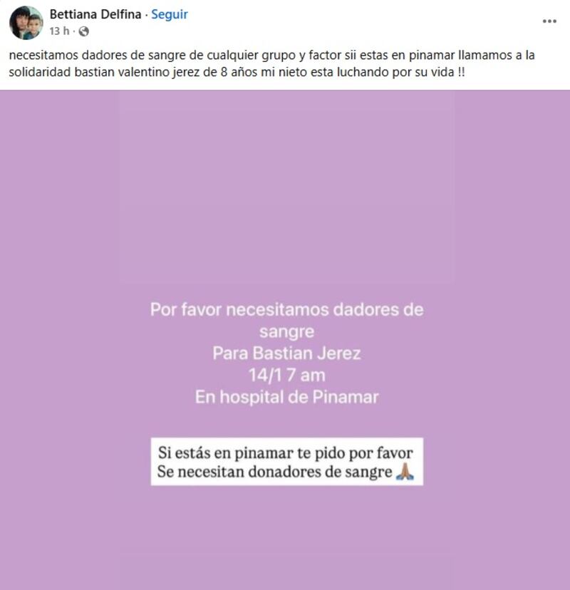 Debido a la enorme pérdida de sangre del joven tras el siniestro, la familia pidió desde las redes sociales dadores para realizarle transfusiones urgentes. En las últimas horas, la abuela del nene publicó en su cuenta de Facebook un pedido. “Si estás en Pinamar, por favor. Mi nieto está luchando por su vida”, escribió Bettiana Delfina. Los dadores de sangre pueden ser de cualquier grupo y factor.