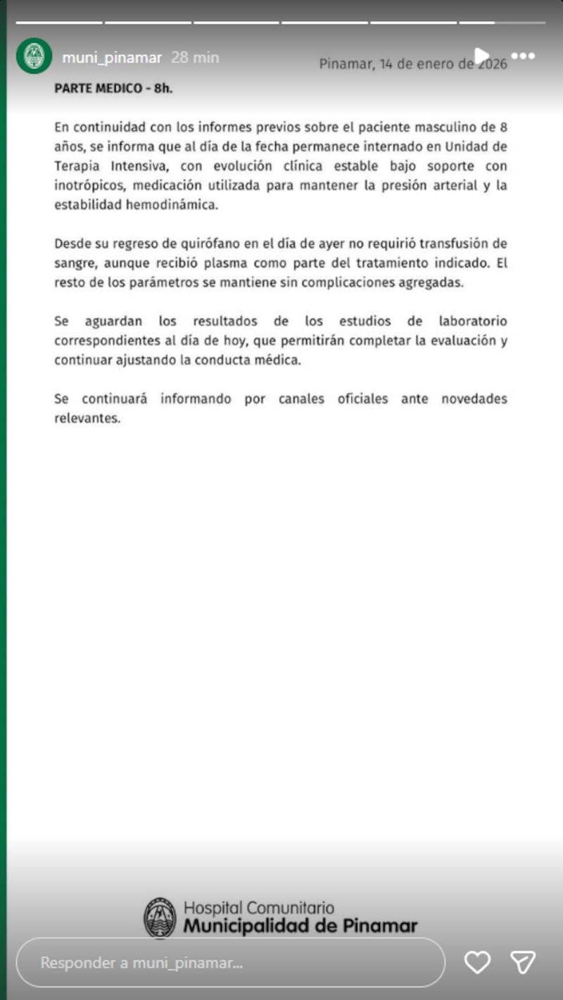En tanto, de acuerdo con el último parte médico difundido esta mañana por el Municipio de Pinamar, la salud del menor se mantiene “estable”, aunque deberá continuar en la Unidad de Terapia Intensiva “bajo soporte con inotrópicosmedicación utilizada para mantener la presión arterialy la estabilidad hemodinámica”.