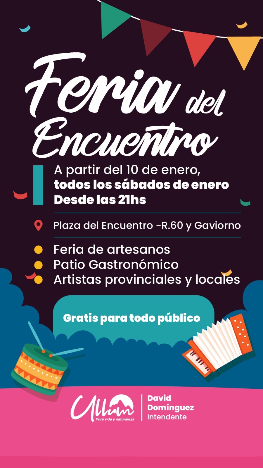 Por tercer verano consecutivo, la Feria del Encuentro se consolida como una cita imperdible en la agenda estival: un espacio gratuito, accesible y lleno de identidad cultural, que impulsa a emprendedores y celebra el disfrute de las noches de verano. Todos los sábados de enero, Ullum te espera para compartir tradición, sabores y mucha música.