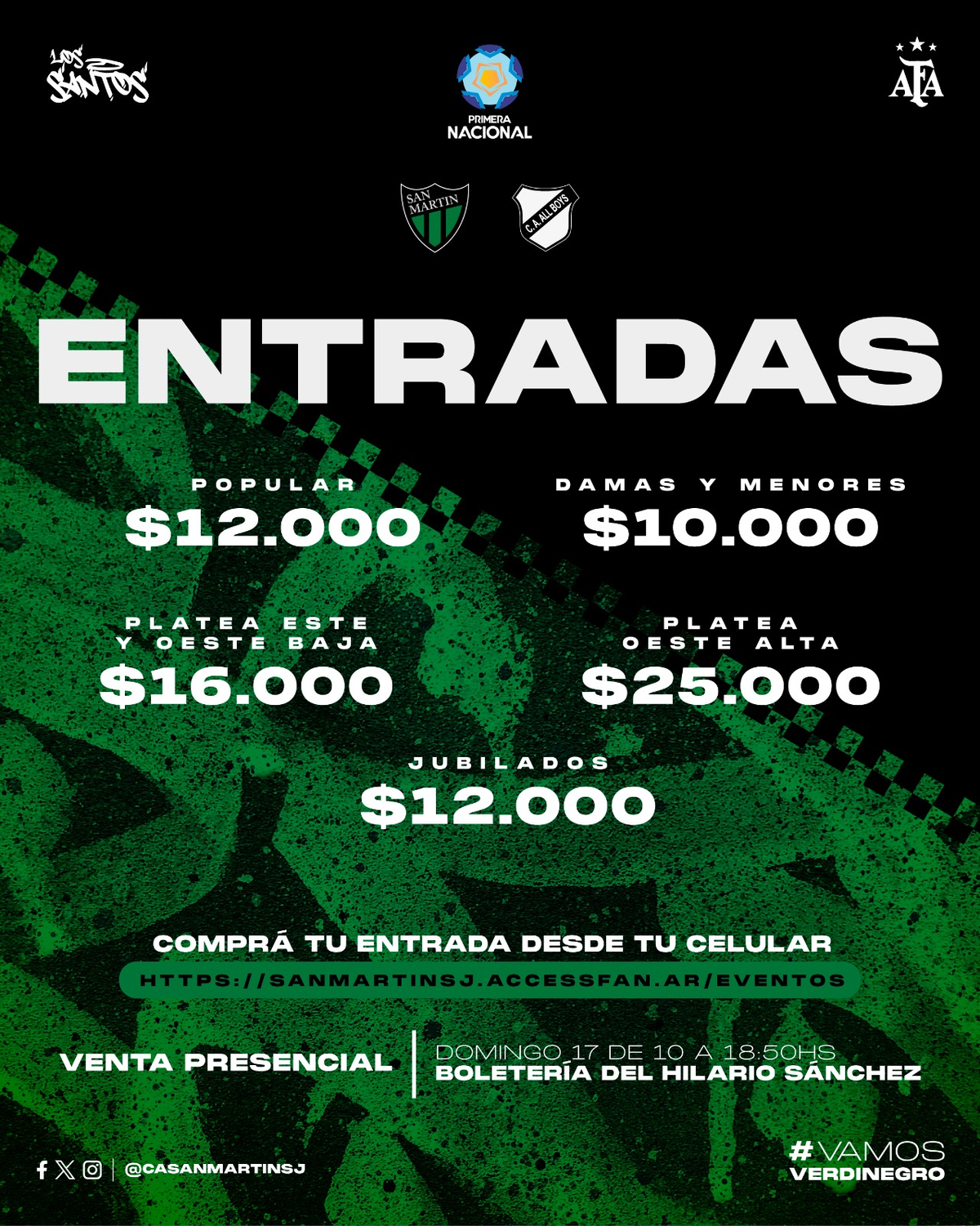Las entradas ya están a la venta de manera online a través de sanmartinsj.accessfan.ar/eventos. La venta presencial será el domingo de 10:00 a 18:50hs.