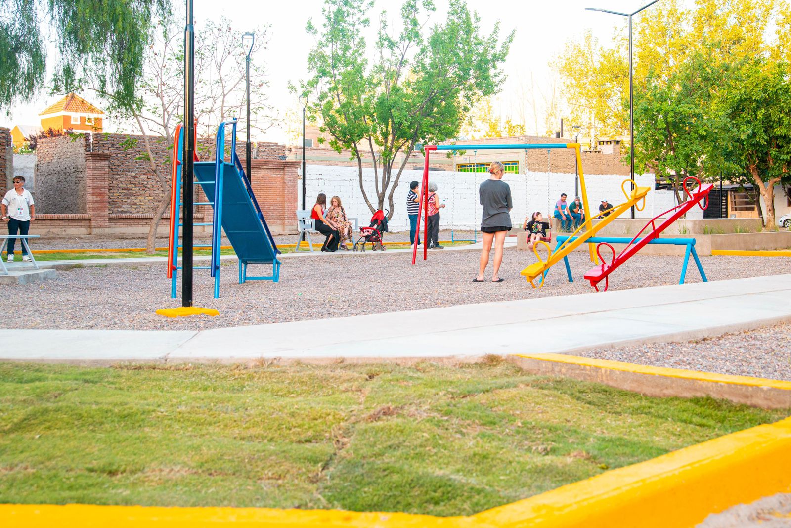 La intervención integral en la plaza del barrio Gemo II contempló la ejecución de 150 metros cuadrados de veredas con hormigón H17, junto a la construcción de 100 metros lineales de cordones perimetrales, 60 metros cuadrados de banquina y 60 metros lineales de cordones delimitadores de espacios internos, lo que permitió ordenar y jerarquizar el uso del predio. Además, se construyeron puentes rampa para mejorar la accesibilidad y se incorporaron juegos infantiles y nuevos aparatos de salud, promoviendo espacios inclusivos para el esparcimiento y la actividad física.