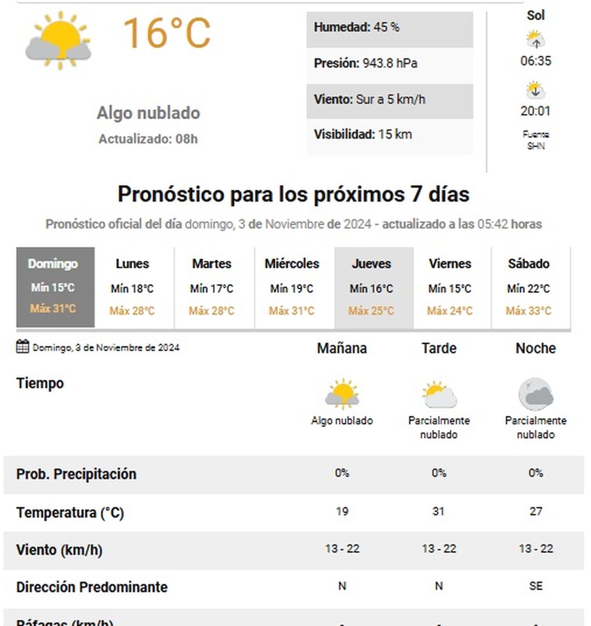 En tanto que la semana comenzará con cielo parcialmente nublado. Para el lunes, el SMN prevé una mínima de 18°C y máxima de 28°C, con viento sur de hasta 31 km/h y ráfagas de hasta 50 km/h para la mañana. Mientras que en la noche, hay probabilidad de 10% a 40% de chaparrones.