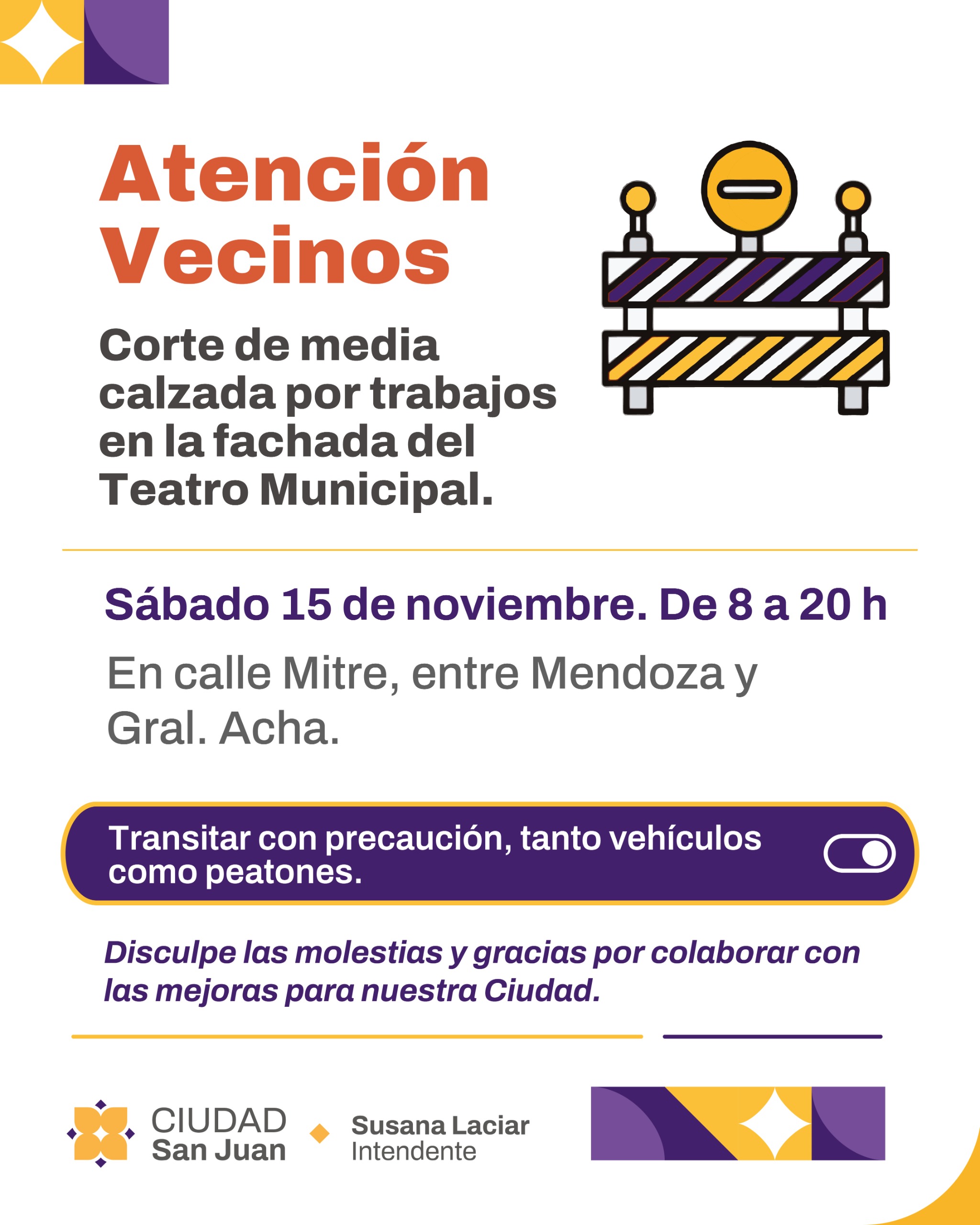 La Municipalidad de la Ciudad de San Juan anunció que este sábado 15 de noviembre se llevará a cabo un corte parcial de circulación en calle Mitre, en el tramo comprendido entre Mendoza y General Acha. La medida regirá desde las 8:00 hasta las 20:00 debido a trabajos de mejora en la fachada del Teatro Municipal.